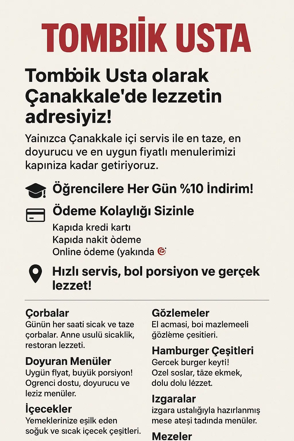 Çanakkale’de okuyan tüm öğrenciler Tombik Usta’da her gün %10 indirimli! Sipariş Esnasında Özel öğrenci indirim kodunuzu girmeyi unutmayın.